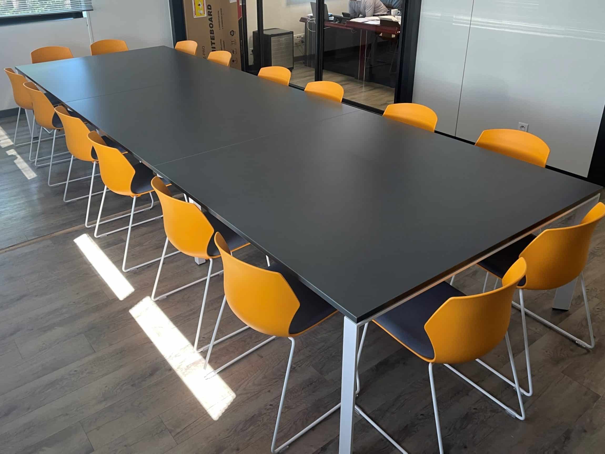 Après des prises de mesures de la salle et des discutions avec le client sur ses besoins, APV Bureau a installé une table de réunion de 4m80 et ses 16 chaises de réunion pour son client de Vénissieux.
