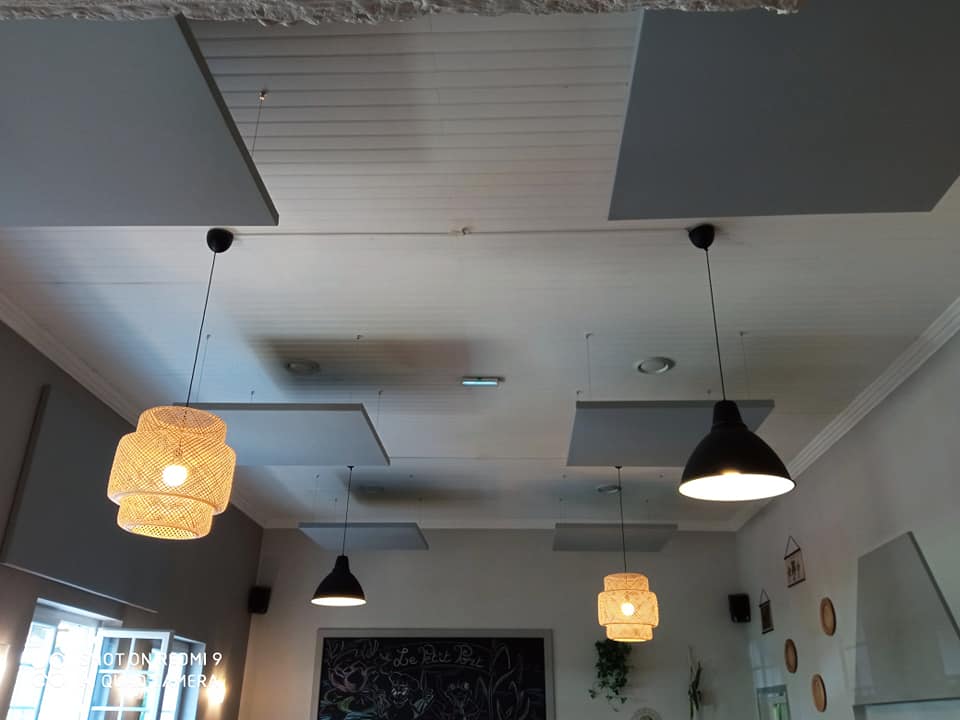 APV Bureau a conseillé, livré et installé des panneaux acoustiques au plafond et au mur de couleur grise.